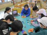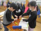 友だちといっしょに活動したり遊んだりすると、できることが増えていきます。写真は、休み時間にけん玉にチャレンジする1年生です。1月頃に比べぐんと上達していました。もう1枚は2年生の算数「はこの形」の授業です。数え棒と粘土玉で、はこの形をペアで組み立てました。