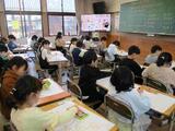 昇降口ホールに『ありがとうの木』にたくさんのメッセージの花が咲いています。なかよしの友だちへ宛てたものや、掃除の班が同じ上級生などへのありがとうのメッセージが貼られているのです。読むとしぜんと笑顔になります。授業の写真は、4年生の音楽です。『世界と日本の音楽』の学習で、和太鼓でおはやしつくりをしました。
